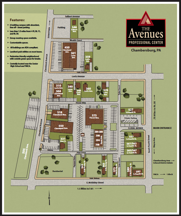 The Avenues is a six building campus featuring ADA compliance, off-street parking, and easy access to amenities.